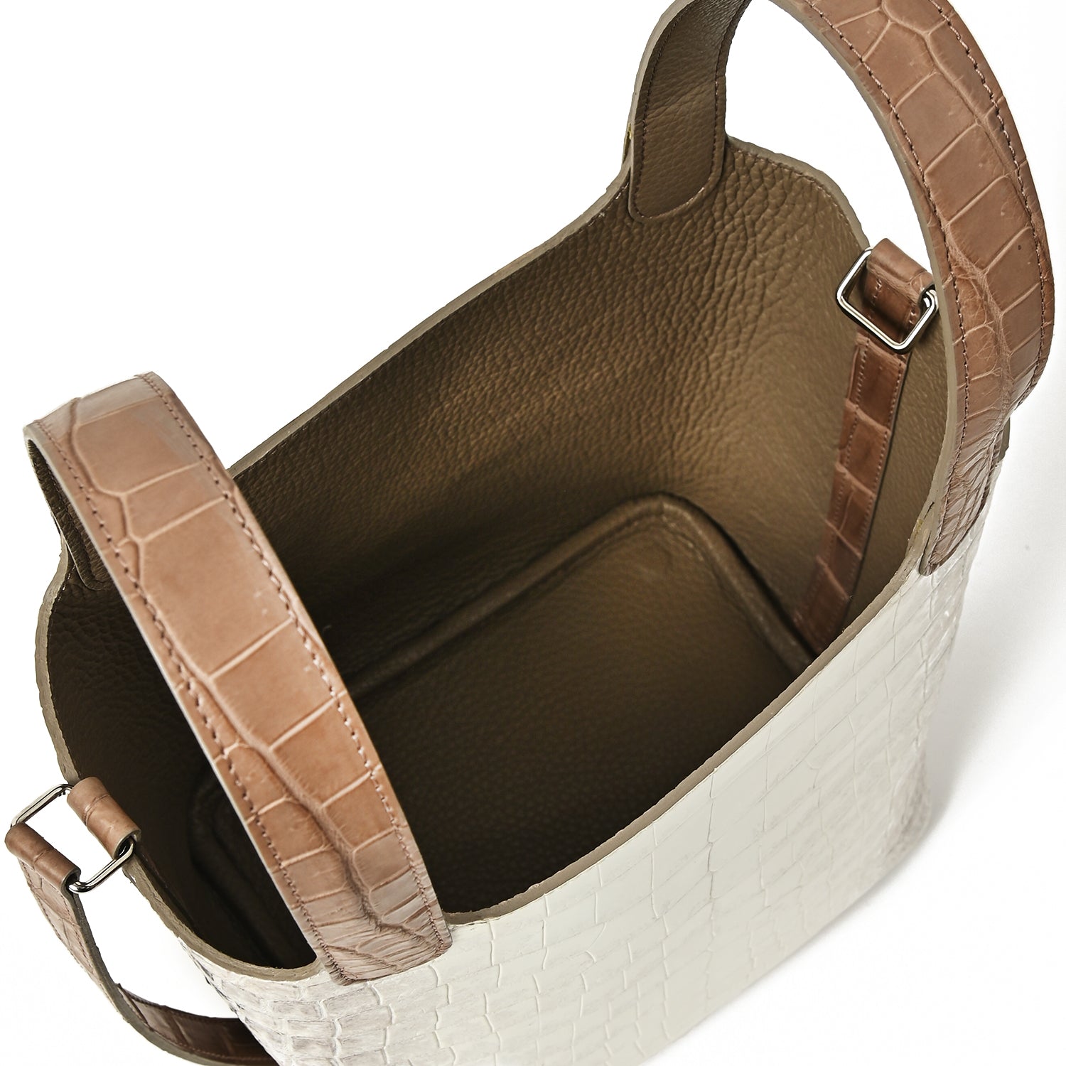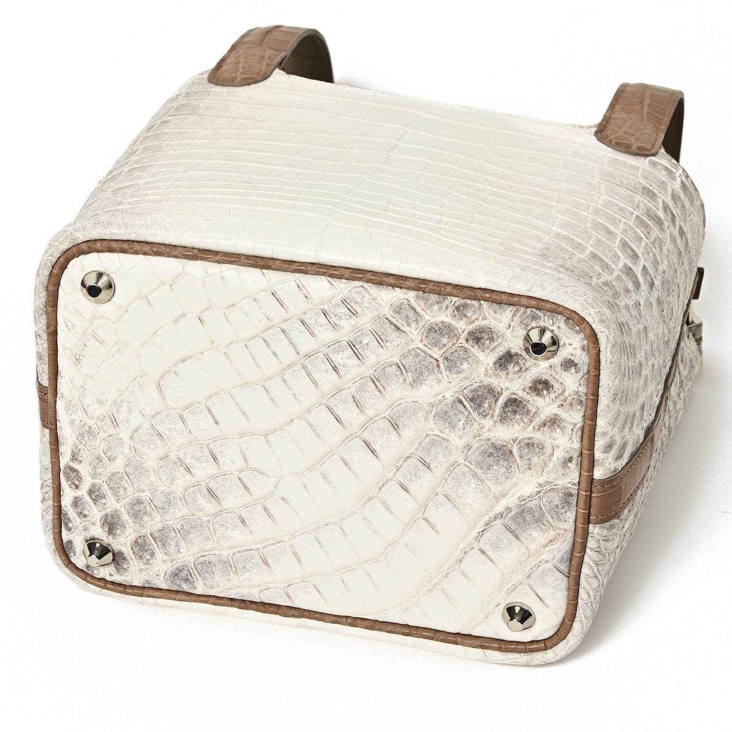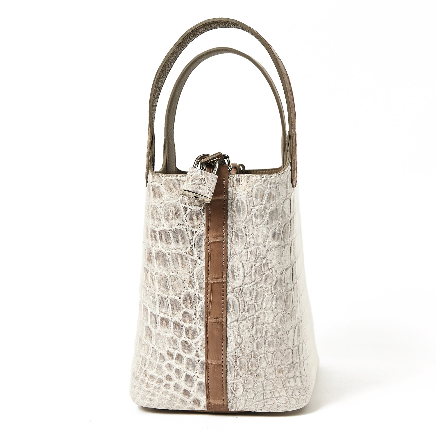 厳選されたスモールクロコダイルのヒマラヤを使用し、丁寧に作り込まれた上品で高級感あふれるキューブ型バッグ。