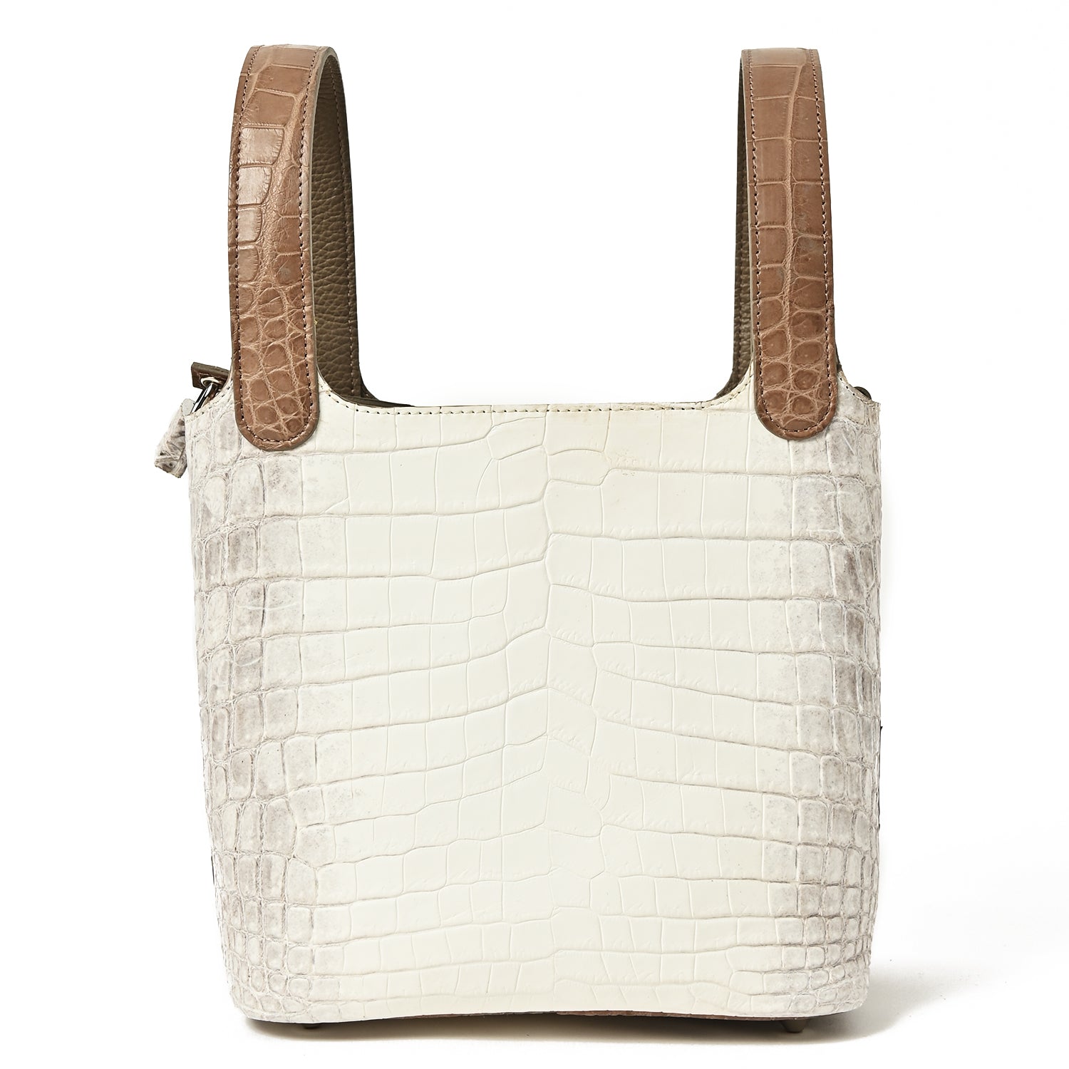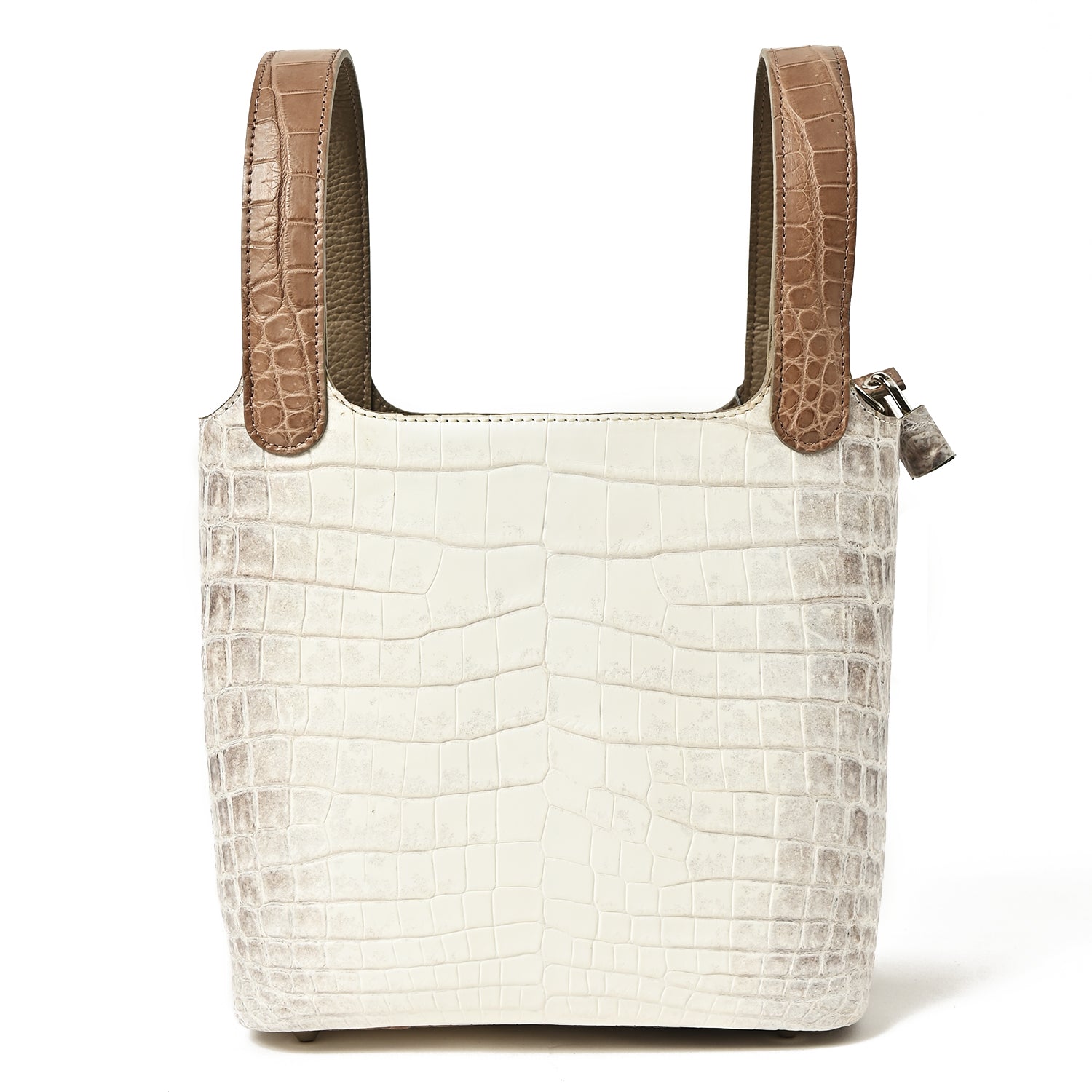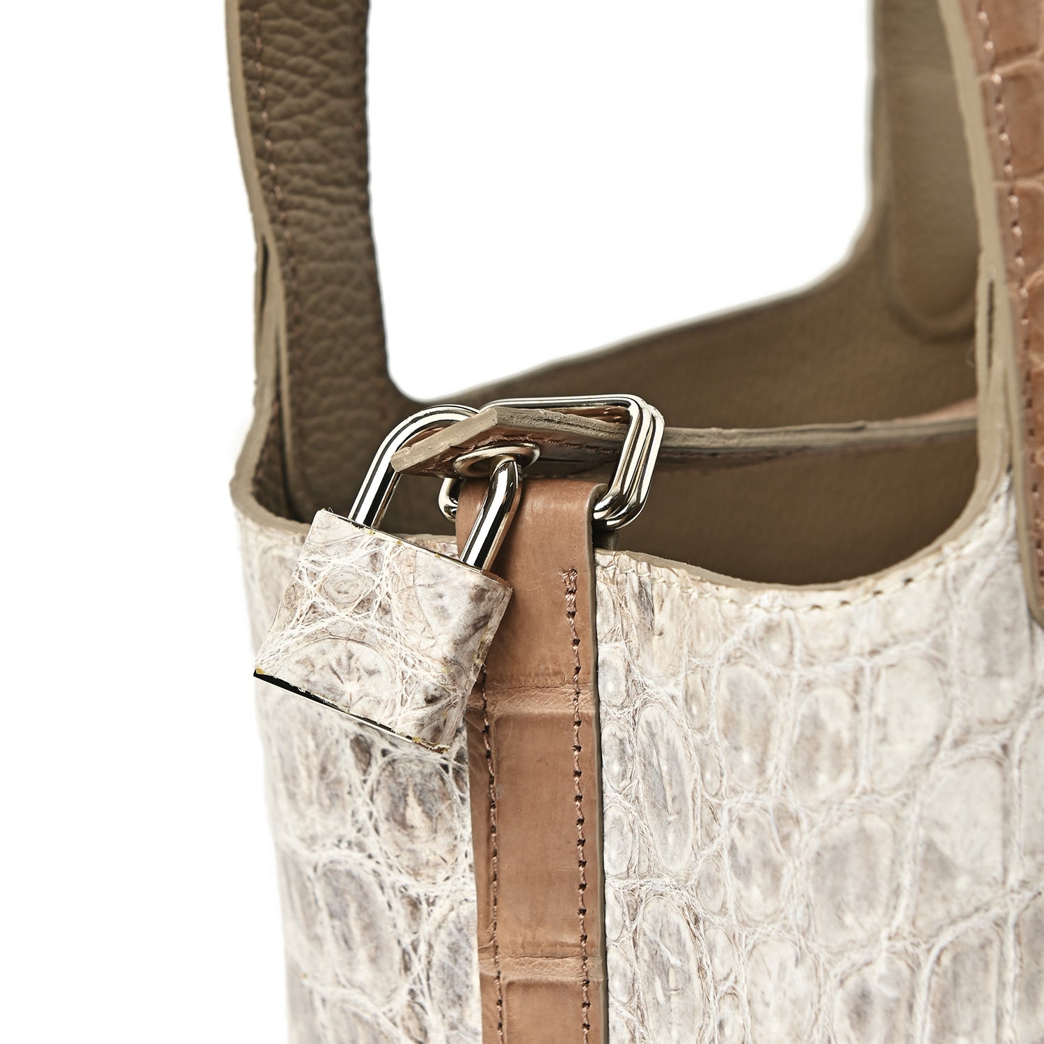 厳選されたスモールクロコダイルのヒマラヤを使用し、丁寧に作り込まれた上品で高級感あふれるキューブ型バッグ。